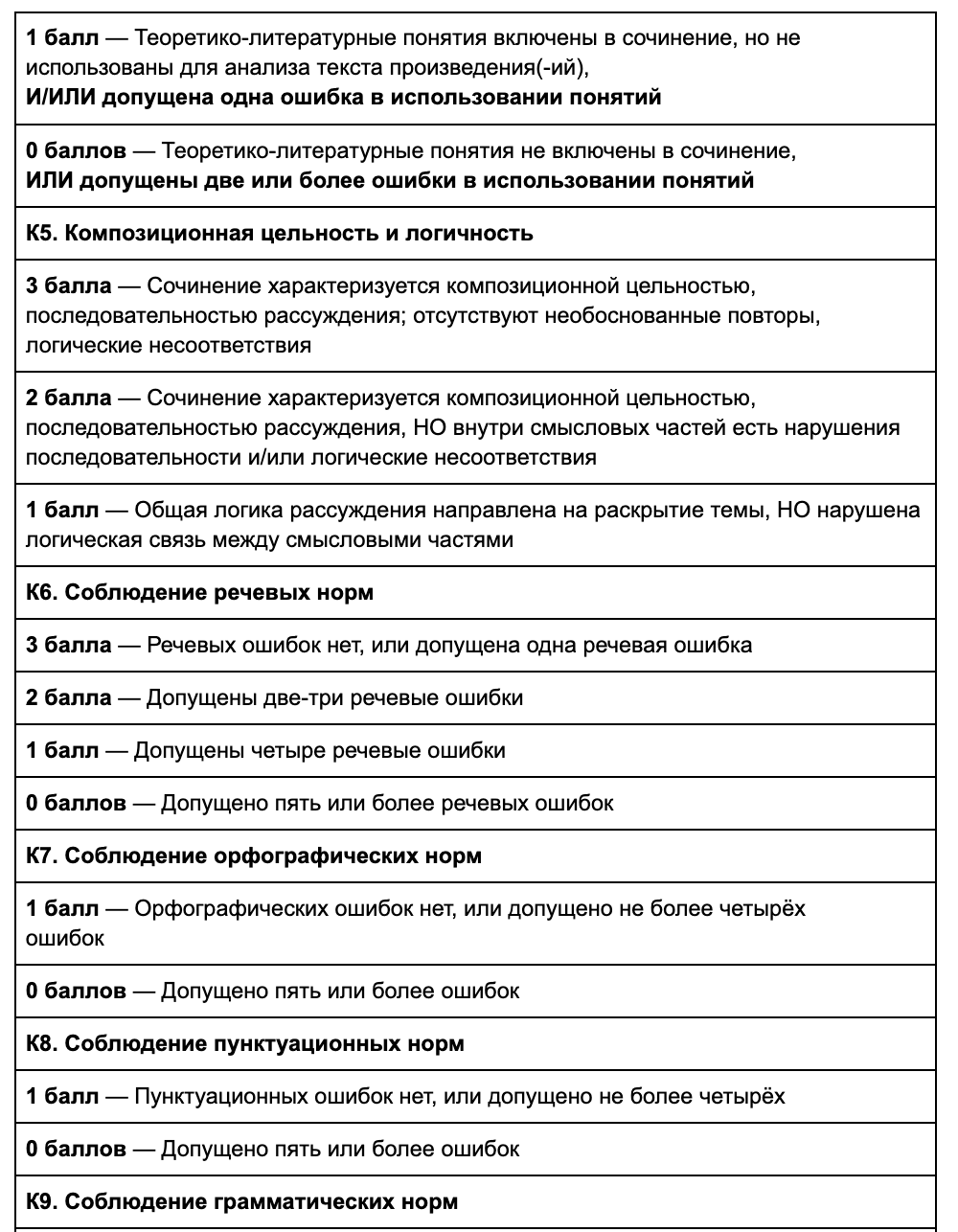 Если сумма выставленных баллов по критериям К1–К6 составляет 6 или менее баллов, то по критериям К7–К9 сочинение оценивается 0 баллов.