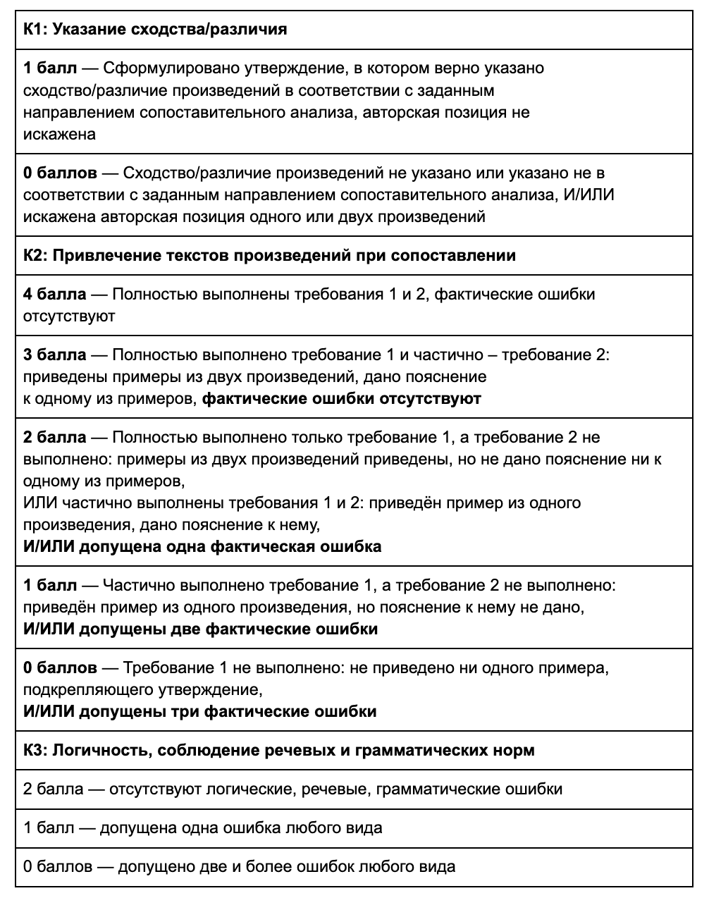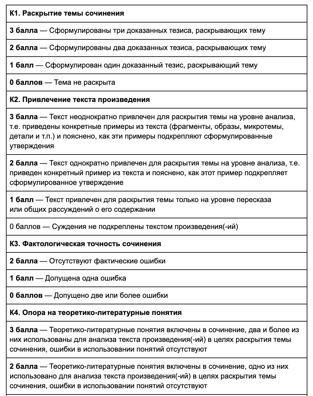 Указание по оцениванию сочинения по критерию К2